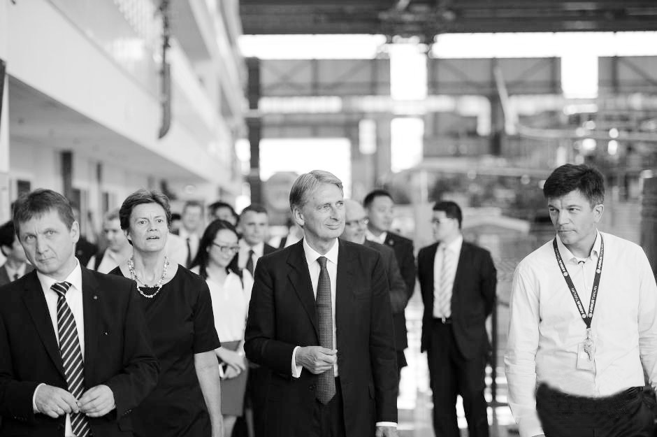 近日,英国外交及联邦事务部大臣菲利浦·哈蒙德(左三)一行来到空客天津总装线参观。据悉,这是哈蒙德自2014年7月被任命为外交大臣以来的首次访华,而他访华一系列活动的第一站就选在了空客A320系列飞机天津总装线。佟郁 摄