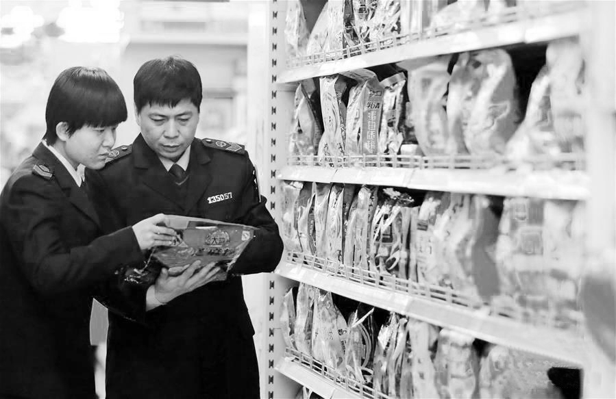 近日,河北省邢台市食药监局执法人员对一家超市销售的食品进行检查。春节将至,河北省邢台市食品药品监督管理局组织执法人员开展节前市场专项大检查,对商场、超市、农贸市场销售的各类食品严检细查,切实把好商品市场准入关,维护春节期间市场消费安全稳定。朱旭东 摄