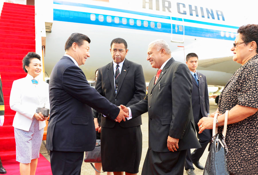 近日,国家主席习近平抵达楠迪,开始对斐济进行国事访问并将同太平洋建交岛国领导人举行会晤。斐济总理姆拜尼马拉马夫妇在舷梯旁迎接习近平和夫人彭丽媛。 李学仁 摄