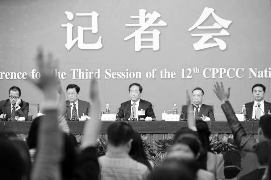 日前,全国政协十二届三次会议新闻中心举行记者会,邀请全国政协委员朱维群、黄洁夫、胡晓义、李彦宏、俞敏洪谈促进民生改善与社会和谐稳定。李鑫 摄